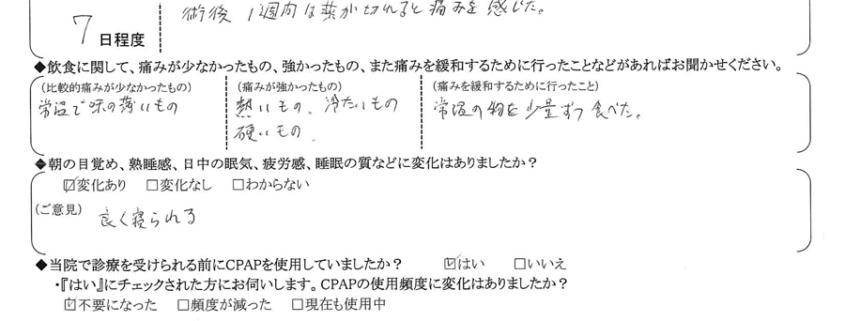 Q.術後、強い痛みは何日程度続きましたか?また、痛みの度合いについて具体的なご意見をお聞かせください。