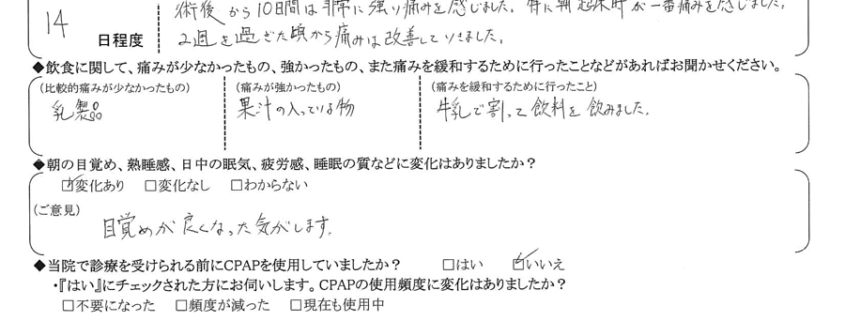 (理由)  術後の痛みは辛いですが、睡眠の質が良くなります。