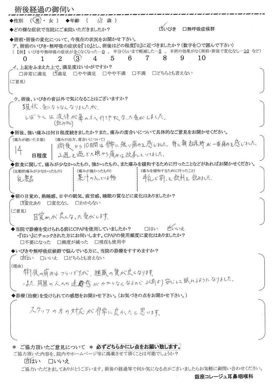 ア, 術前のいびき・無呼吸の症状を『10』だったとすると、術後はどの程度になりましたか? 【3】