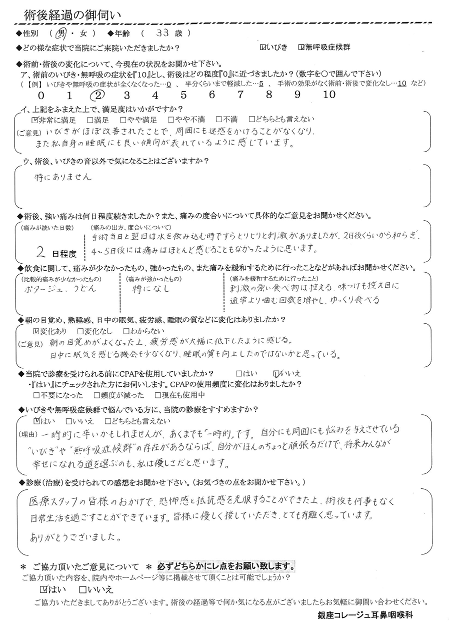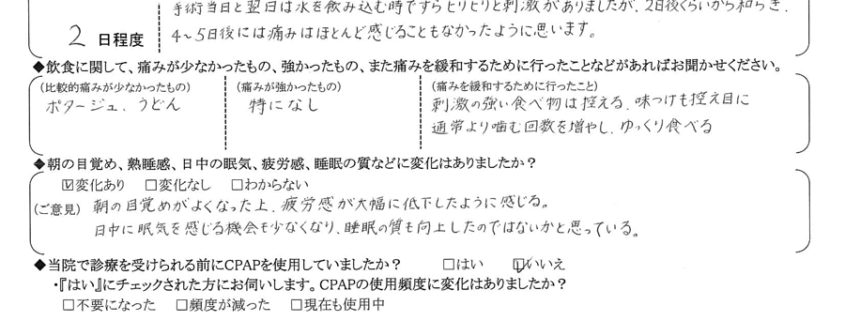 (ご意見) いびきがほぼ改善されたことで、周囲にも迷惑をかけることがなくなり、