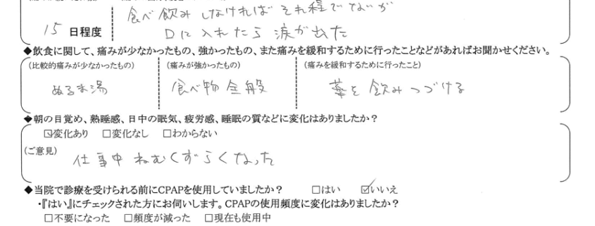 (痛みの程度について) 食べ飲みしなければ、それ程ではないが、口に入れたら涙が出た。