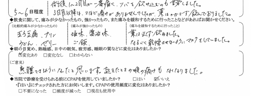 (痛みの程度について) 術後1~2日目が一番痛く、ツバを飲み込むのも苦労しました。