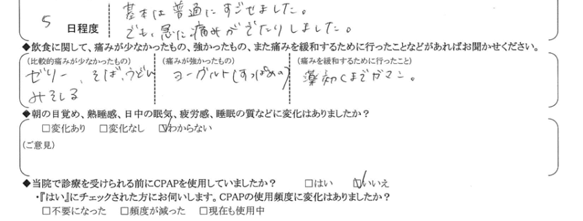 A:(痛みが少なかったもの) ゼリー・そば・うどん・味噌汁