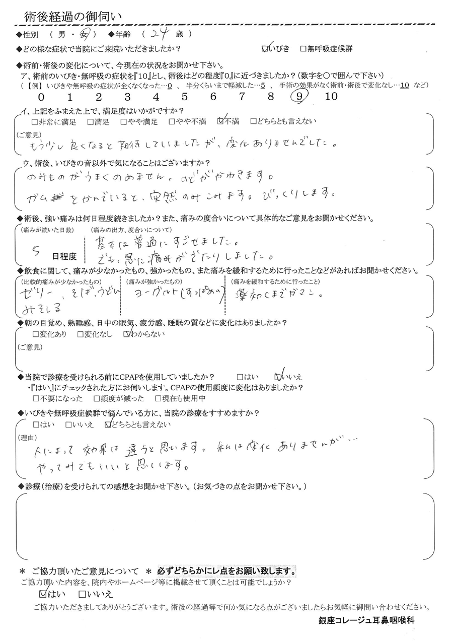 ア, 術前のいびき・無呼吸の症状を『10』だったとすると、術後はどの程度になりましたか? 【9】