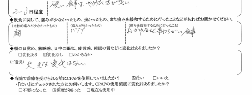 (痛みの程度について) 硬い食事はやめた方が良い。