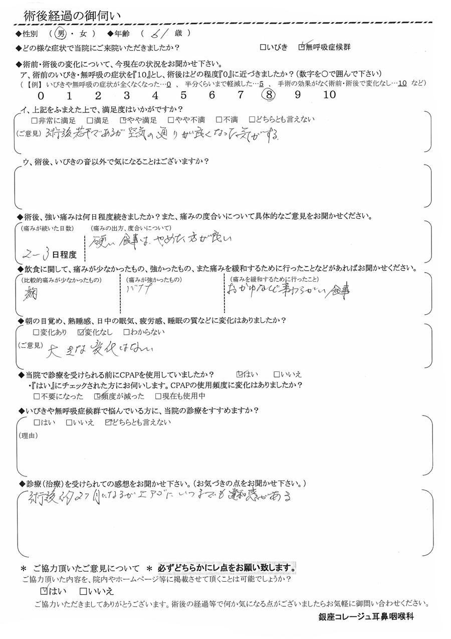 ア, 術前のいびき・無呼吸の症状を『10』だったとすると、術後はどの程度になりましたか? 【8】