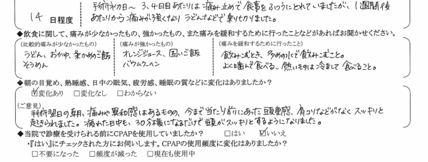 (ご意見) 手術翌日の朝、痛みや違和感はあるものの、今まで当たり前にあった頭重感や肩凝りなどが無くなり