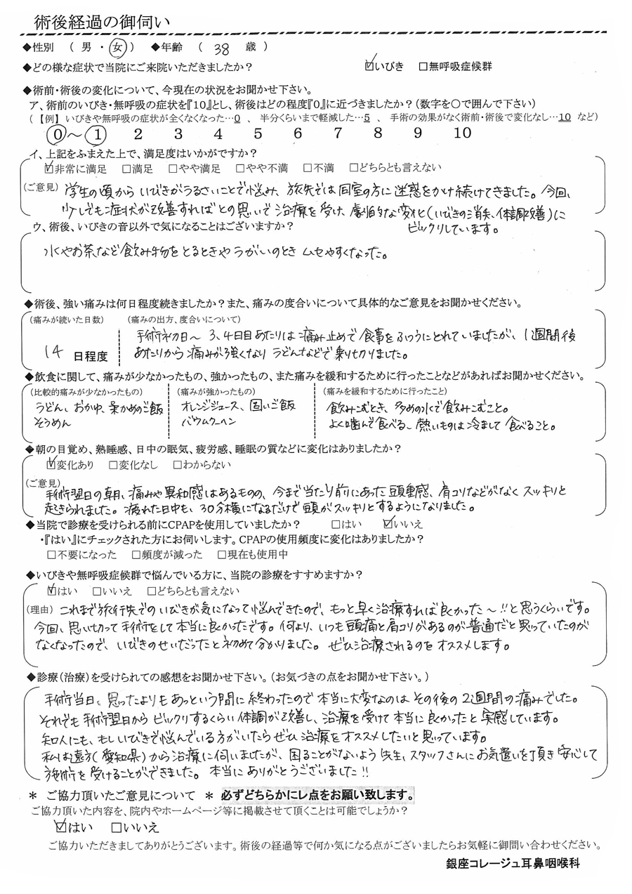 (理由) これまで旅行先でのイビキが気になって悩んできたので、「もっと早く治療すれば良かった~!!」と思うくらいです。今回、思い切って手術をして本当に良かったです。何より、いつも頭痛と肩凝りがあるのが普通だと思っていたのが無くなったので、イビキのせいだと初めて分かりました。是非、治療されるのをオススメします。
