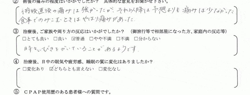 ウ、いびきの音以外で、術後気になる点はございますか?