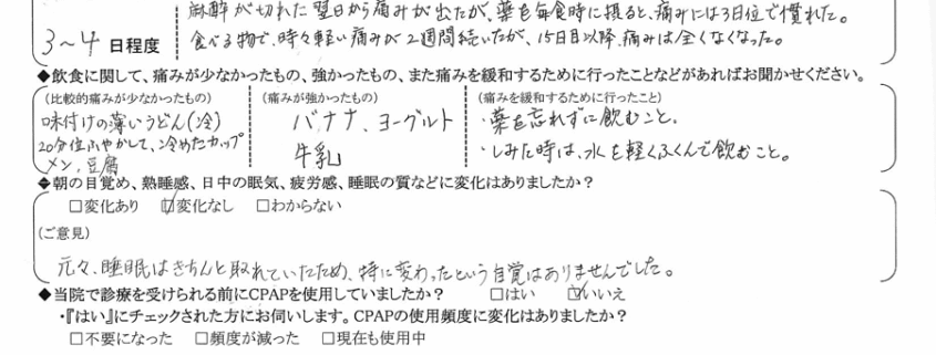 (痛みの程度について) 麻酔が切れた翌日から痛みが出たが、薬を毎食時に摂ると痛みは3日位で慣れた。