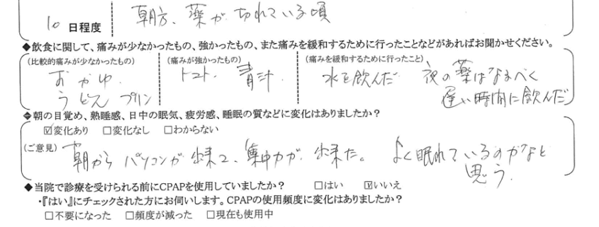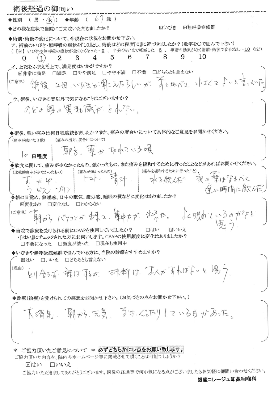 (ご意見) 術後2回、イビキが聞こえたらしいが「前と比べて、小さくて良い」と言っていた。