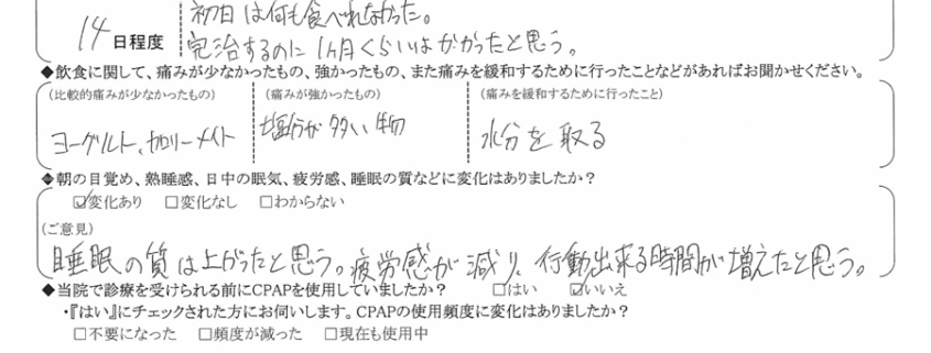 (痛みの程度について) 初日は何も食べられなかった。完治するのに1ヶ月くらいはかかったと思う。