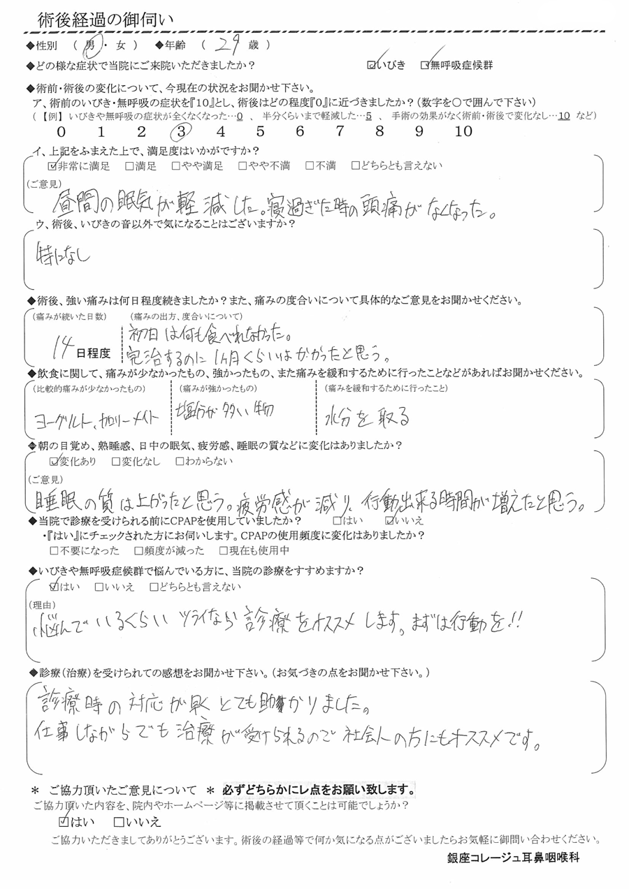 ア, 術前のいびき・無呼吸の症状を『10』だったとすると、術後はどの程度になりましたか? 【3】