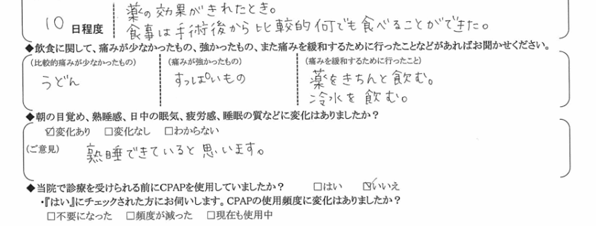 (痛みの程度について) 薬の効果が切れた時。食事は手術後から比較的、何でも食べる事ができた。