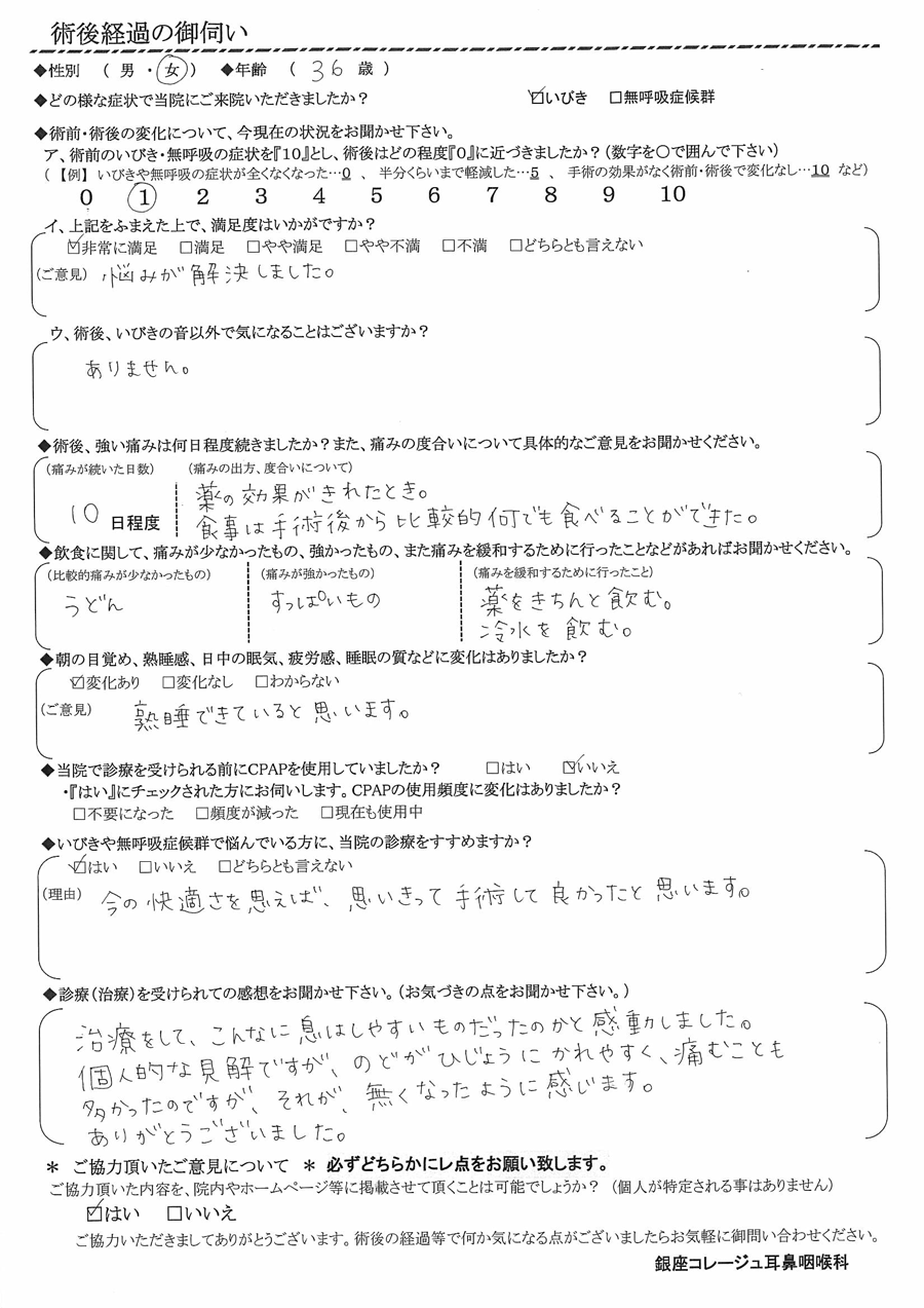 ア, 術前のいびき・無呼吸の症状を『10』だったとすると、術後はどの程度になりましたか? 【1】