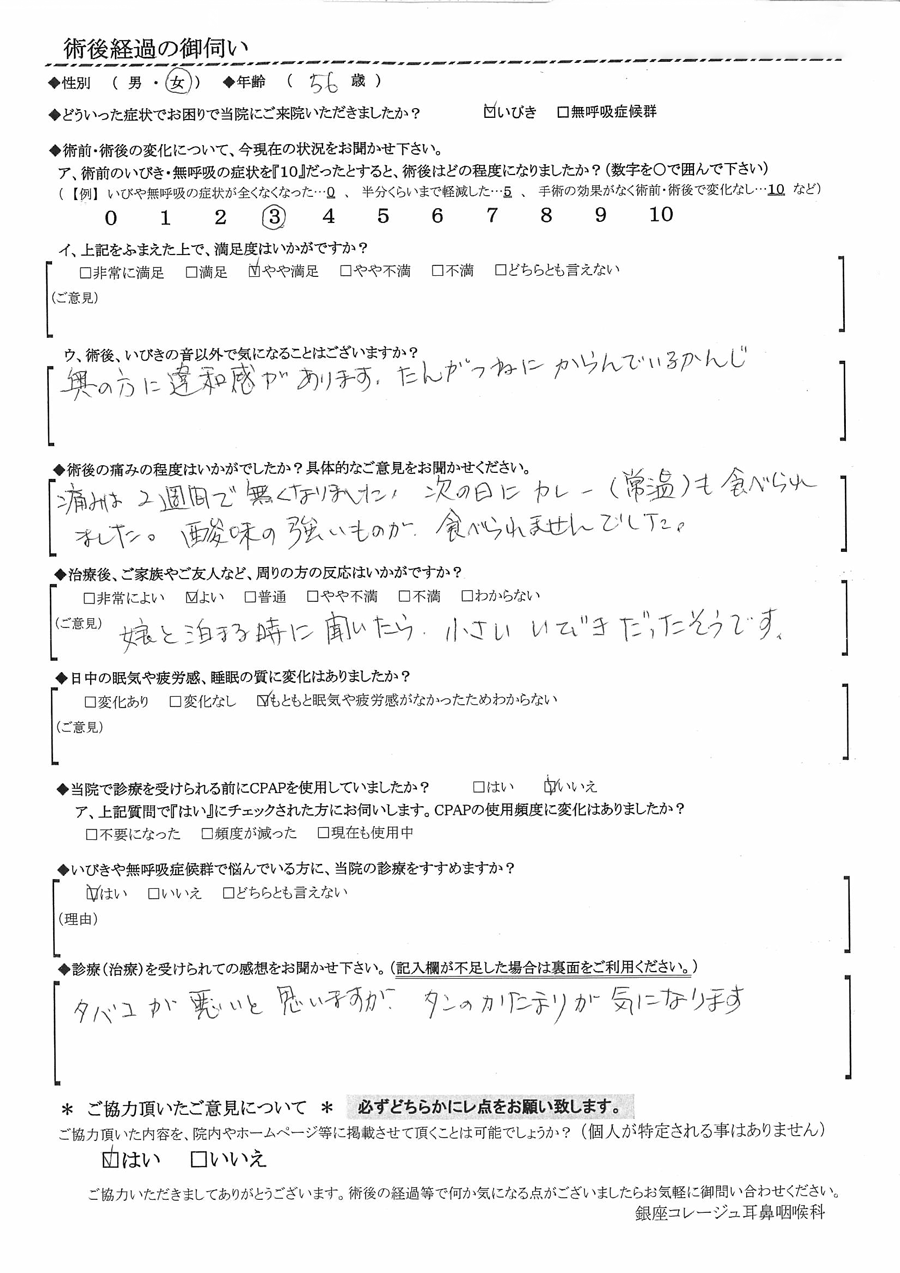 ア, 術前のいびき・無呼吸の症状を『10』だったとすると、術後はどの程度になりましたか? 【3】
