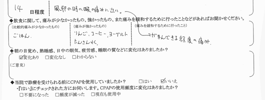 (痛みの程度について) 風邪の時の喉の痛みに近い。我慢できる程度の痛み。