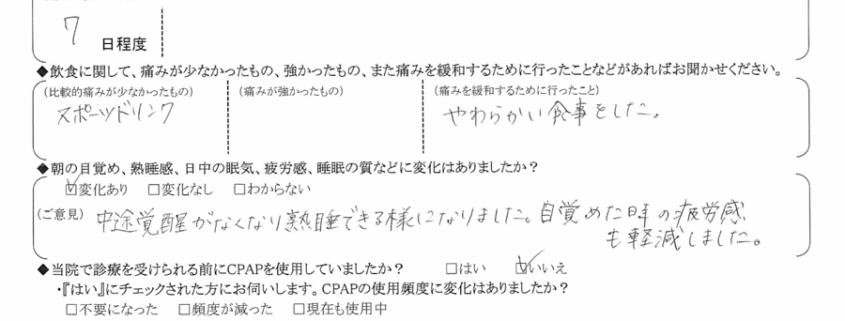 (ご意見) 中途覚醒がなくなり熟睡できる様になりました。目覚めた時の疲労感も軽減しました。