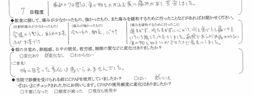 (痛みの程度について) 最初の7日間は食べ物を飲み込む度に痛みがあり、苦労しました。