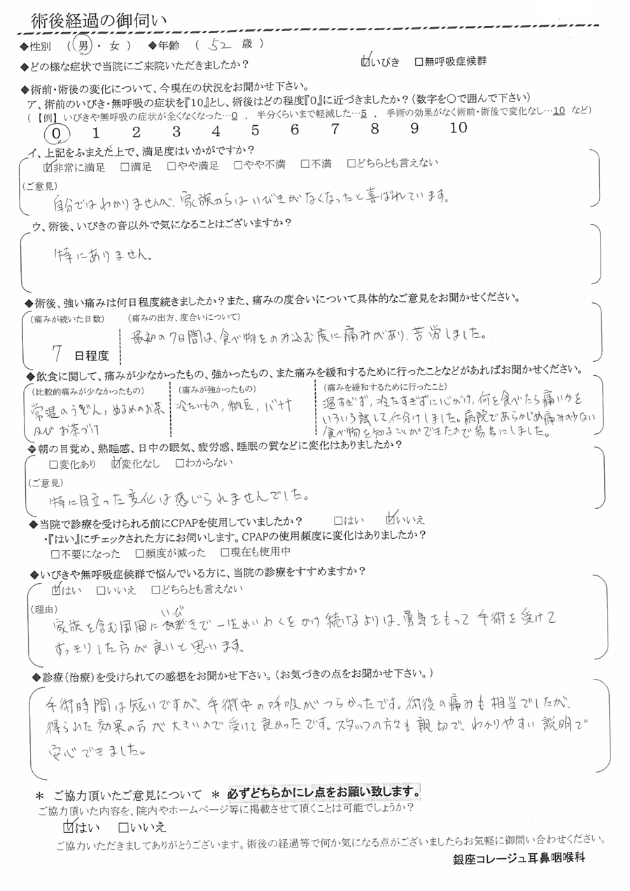 (理由)  家族を含む周囲にイビキで一生迷惑をかけ続けるよりは、勇気を持って手術を受けて、スッキリした方が良いと思います。