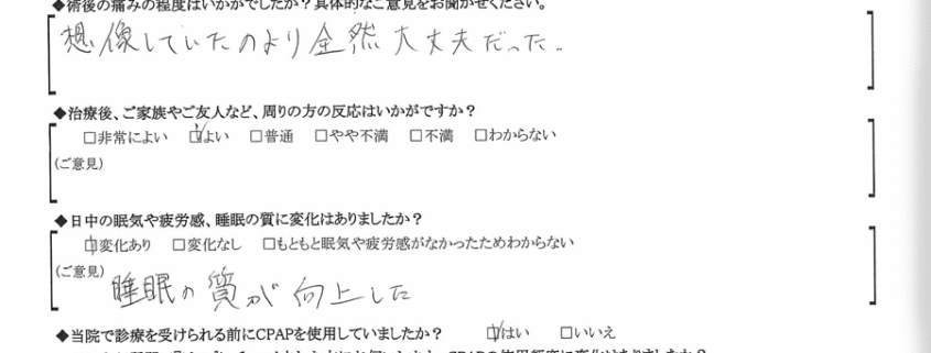 A: 睡眠の質が変わり、無呼吸が無くなったのは良かった。