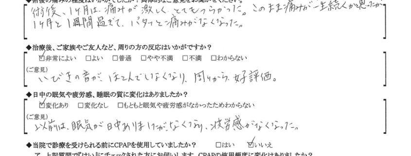 A: 手術を行い、本当にイビキの症状が無くなり感謝しております。もっと早く手術をしていたらと悔やみますが今は気にせず旅行に行く事が何より嬉しい事です。本当にありがとうございました。