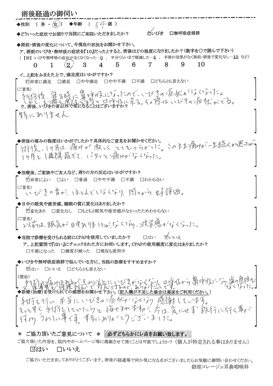 (ご意見) 手術後、寝る時に鼻呼吸になったので、イビキの症状が無くなった。しかも、お酒を飲むと時々、口呼吸に戻る。その際はイビキの症状が出る。