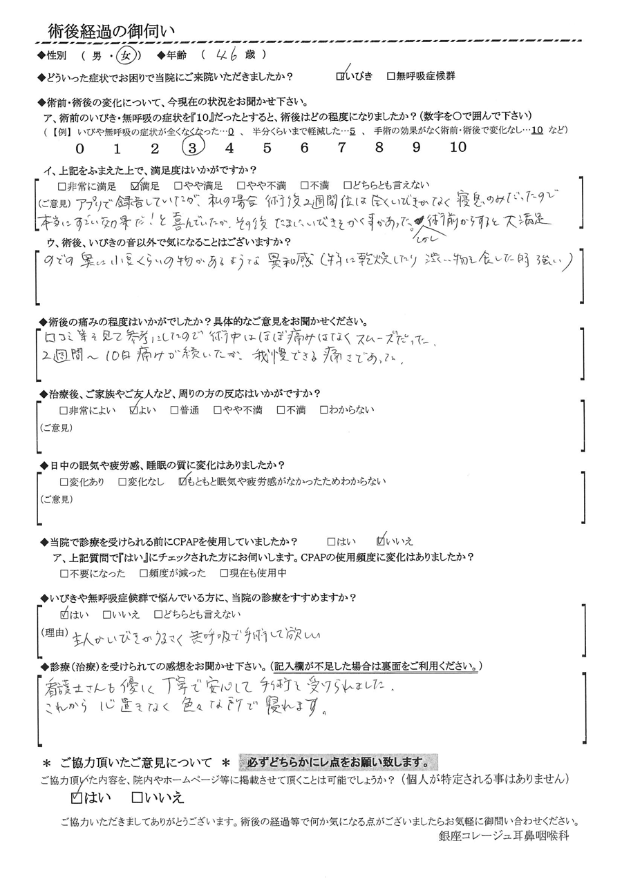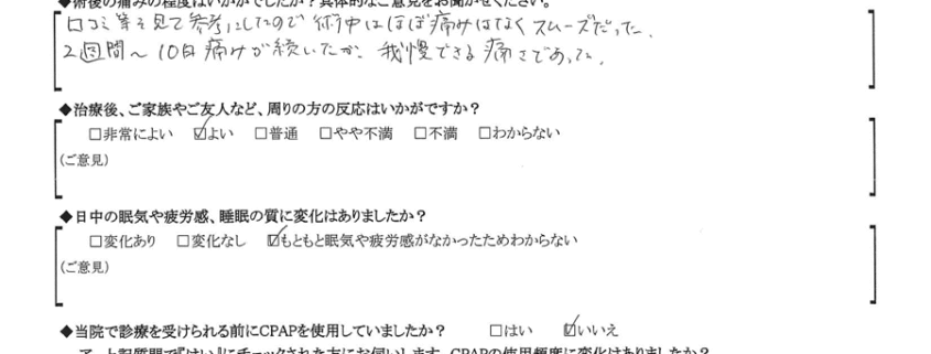 (ご意見) アプリで録音していたが、私の場合は術後2週間位は全くイビキが無く寝息のみだったので「本当に凄い効果だ!」と喜んでいたが、その後にたまにイビキをかく事があった。しかし、術前からすると大満足。
