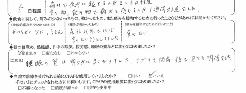(ご意見) 睡眠の質は明らかに良くなりました。アプリで術前後を見ても明確でした。