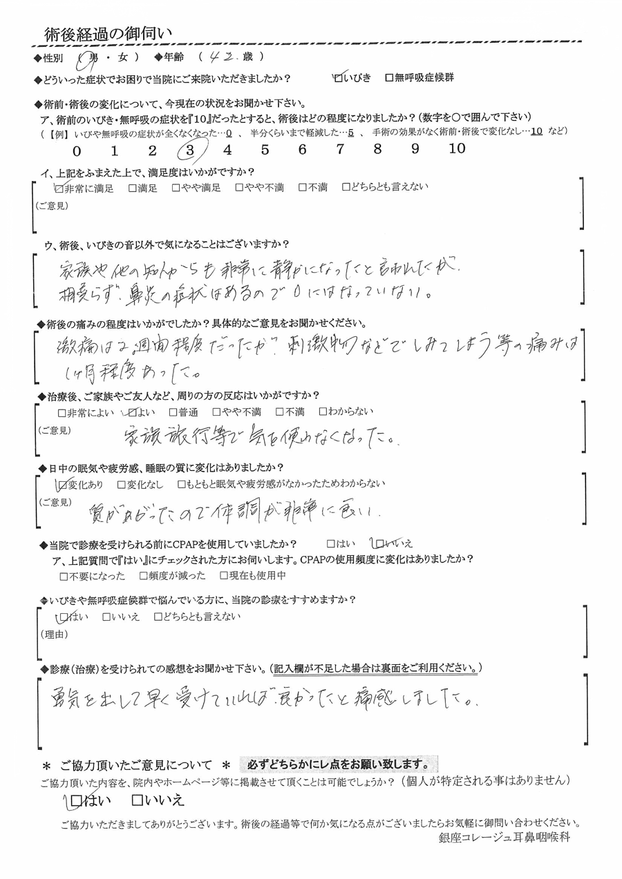 家族や他の知人からも非常に静かになったと言われたが、相変わらず鼻炎の症状があるので0にはなっていない。