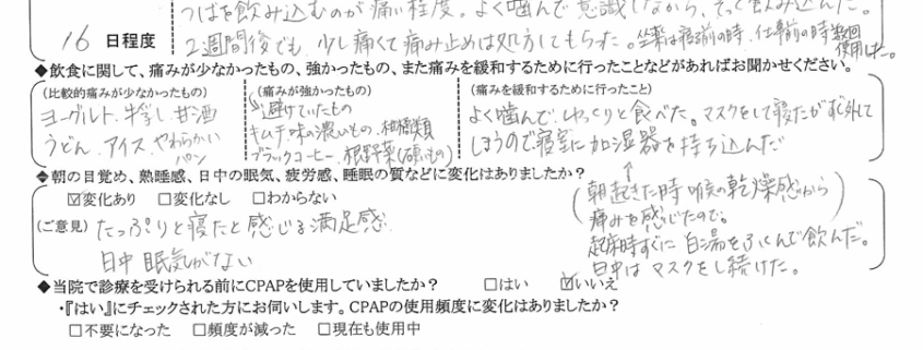 A:(痛みを緩和するために行ったこと) よく噛んで、ゆっくりと食べた。起床時に直ぐ白湯を飲む。日中はマスクをする。マスクをして寝たが、直ぐ外してしまうので、寝室に加湿器を持ち込んだ。(朝起きた時に喉の乾燥から痛みを感じたので)