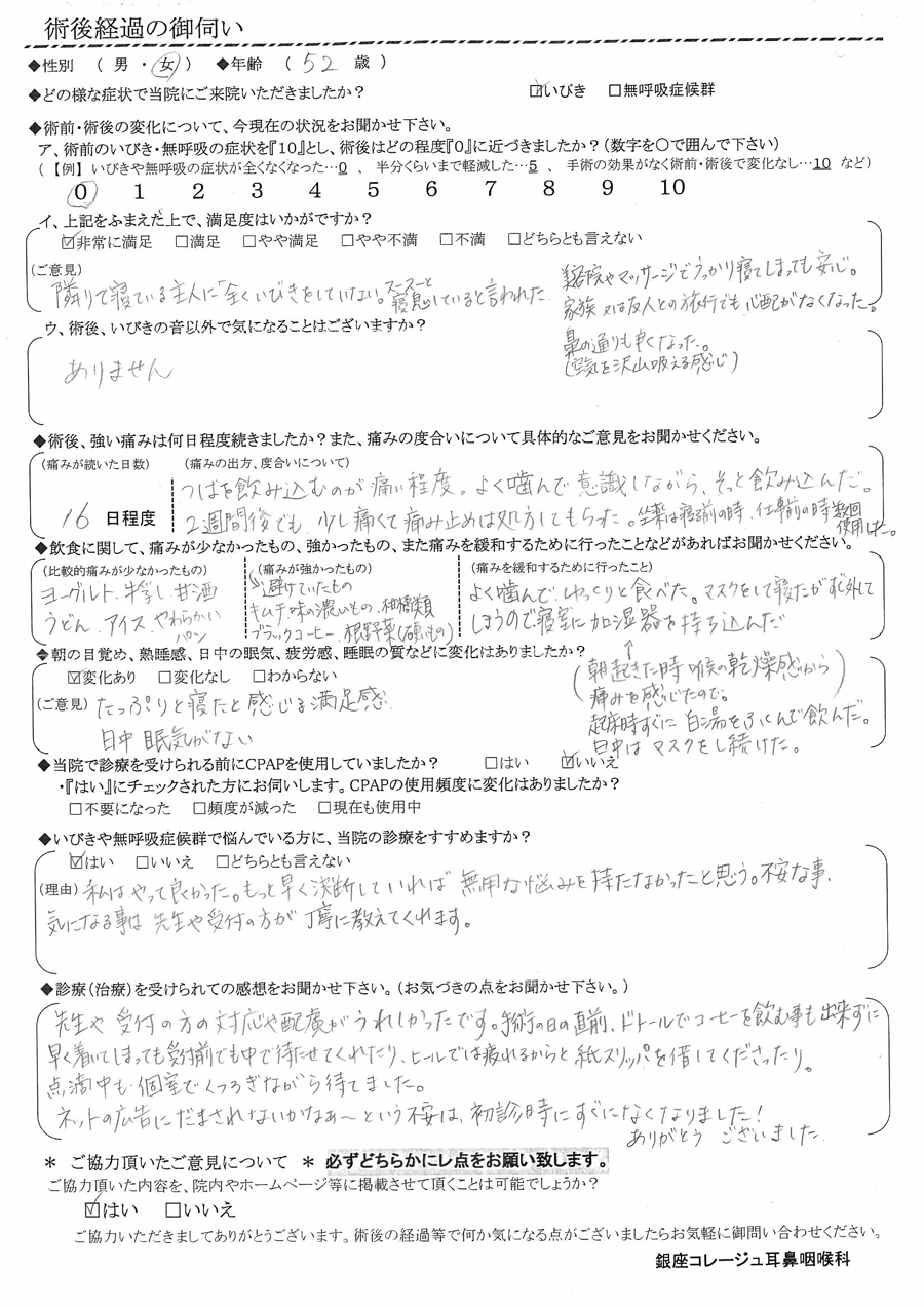 (ご意見) 隣で寝ている主人に「全くイビキをしていない。スースーと寝息している」と、言われた。