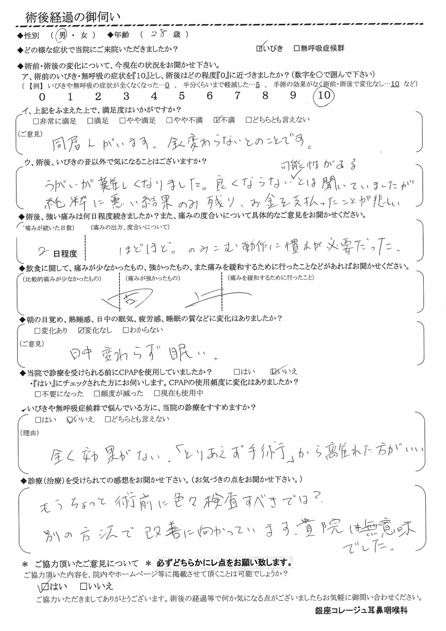 ア, 術前のいびき・無呼吸の症状を『10』だったとすると、術後はどの程度になりましたか? 【10】