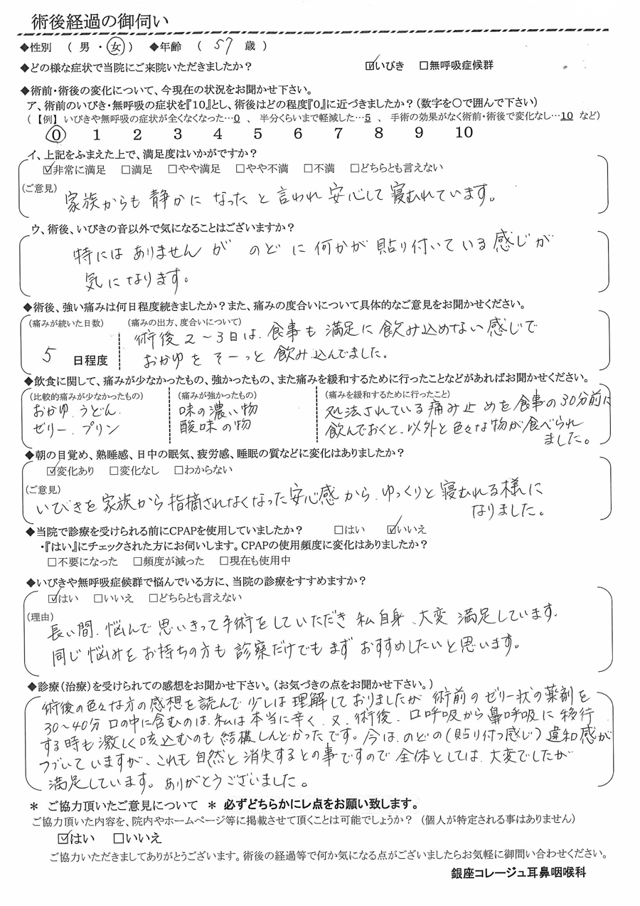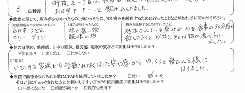 (ご意見)  イビキを家族から指摘されなくなった安心感から、ゆっくり眠れる様になりました。