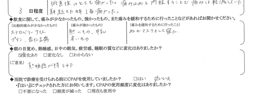 (痛みの程度について) 術直後はとても痛かった。痛み止めを服用する事で痛みは軽減した。