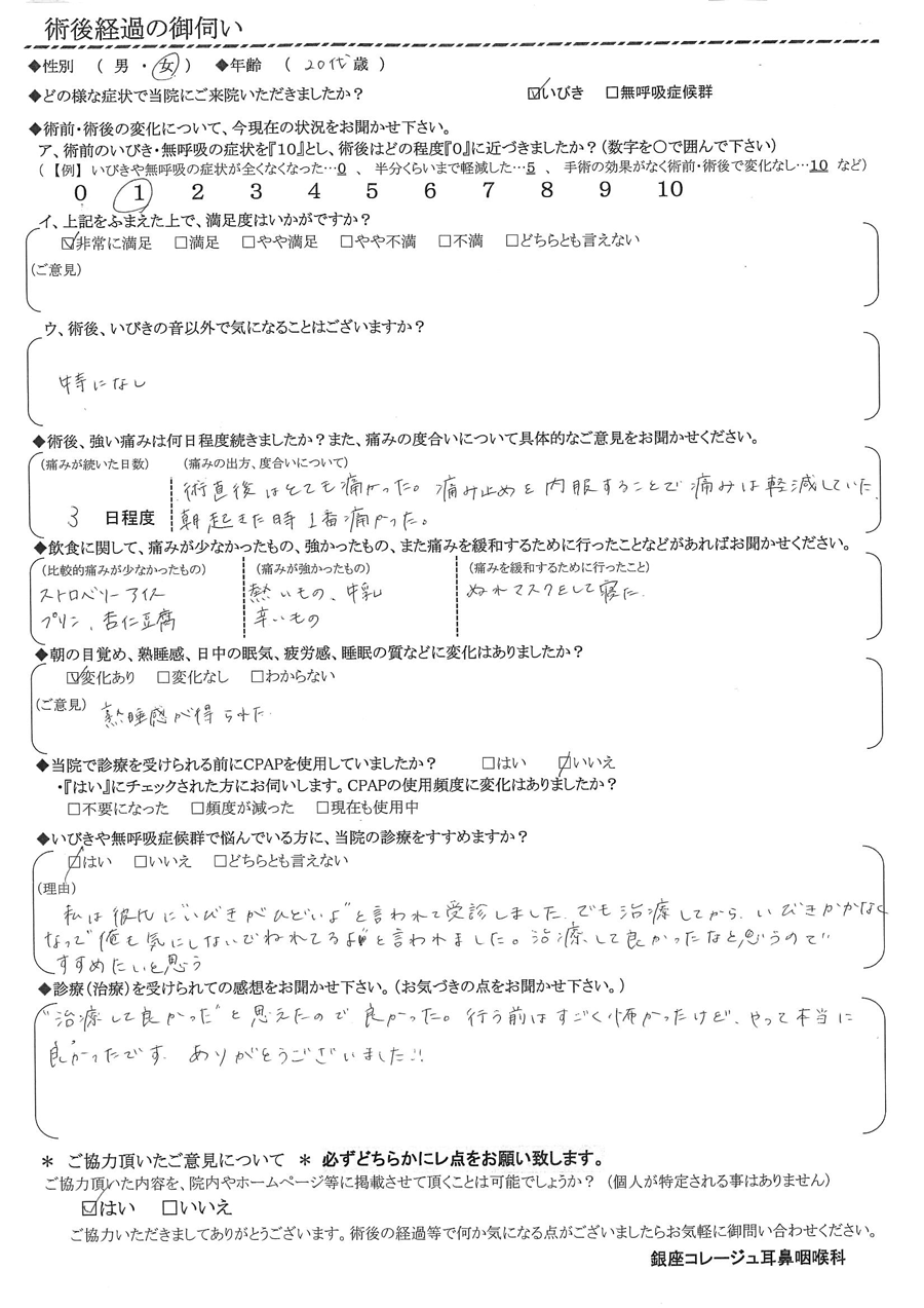 (理由) 私は彼氏に「イビキがヒドイよ」と言われて受診しました。治療してからイビキをかかなくなって、彼氏に「俺も気にしないで眠れているよ」と言われました。治療して良かったなと思うので、勧めたいと思う。