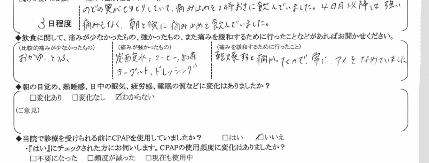 (痛みの程度について) 喉の奥がヒリヒリしていて、痛み止めを2時間おきに飲んでいました。4日目以降は強い痛みもなく、朝と晩に痛み止めを飲んでいました。