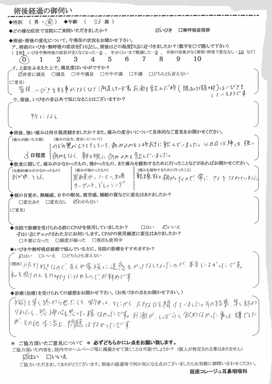 (ご意見) 普段、イビキをする事がなくなり満足しています。お酒を飲んだ時(酔っぱらう程度の時)は、イビキをしているようです。