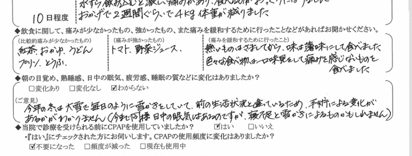 (ご意見) 今年の冬は大雪で毎日のように雪かきをしていて、前の生活状況と違っているため、手術前による変化があるかが分かりません。(今まで同様、日中の眠気はあるのですが、寝不足と雪かきによるものかもしれません)