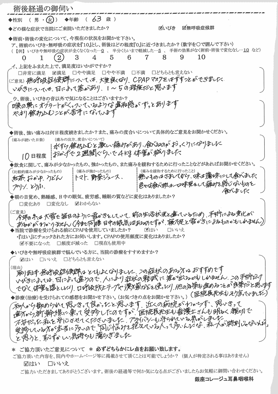 (ご意見) 無呼吸症候群については、大変良くなりCPAPマスクを外すことができました。イビキについては、日によって差があり、1~5の程度だと思います。