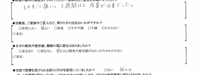 (ご意見) 疲れていたり、飲酒後はイビキが出ますが普段はほとんどイビキが出なくなり、だいぶ改善されました。
