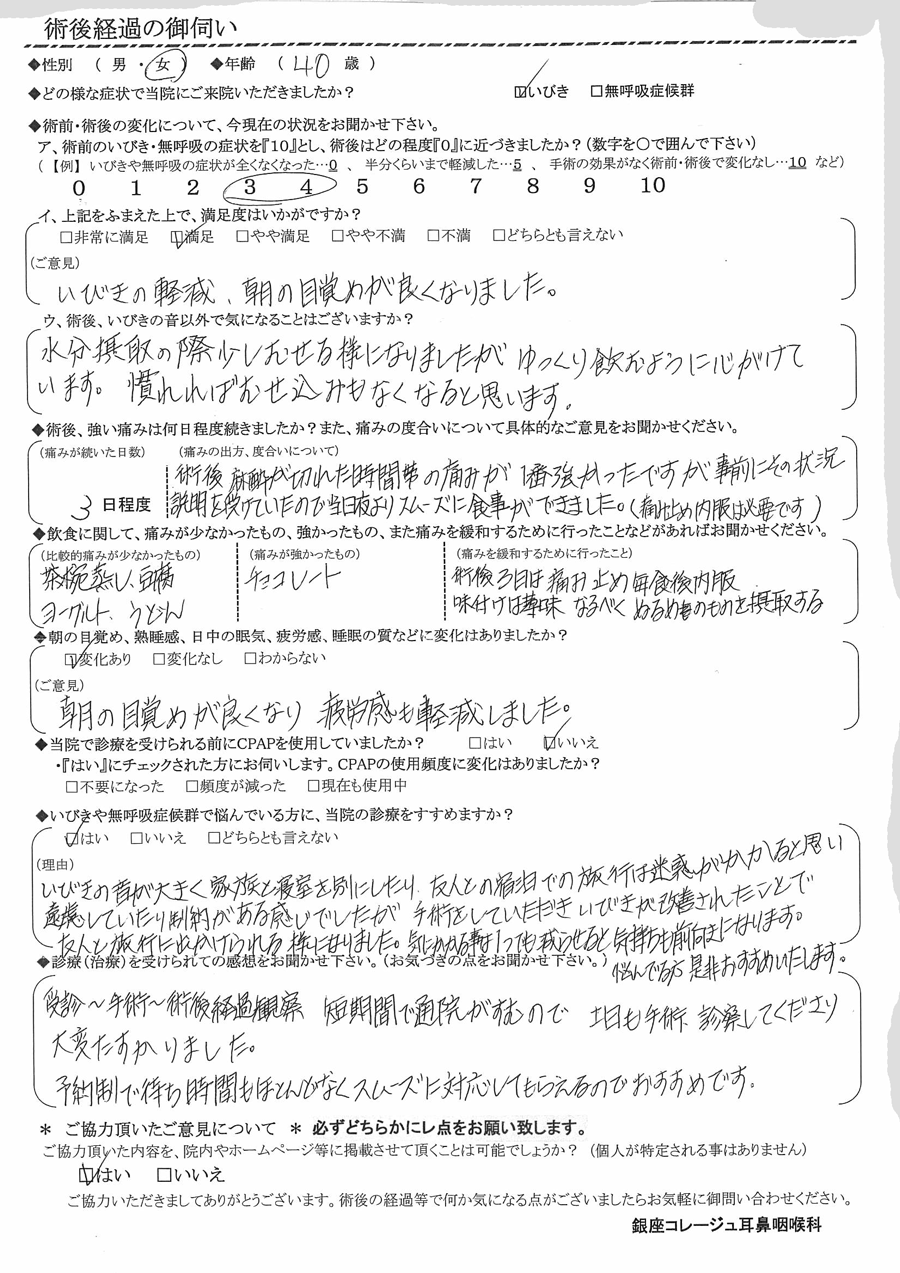 (理由) イビキの音が大きく、家族と寝室を別にしたり、友人との宿泊での旅行は迷惑がかかると思い遠慮していたり制約がある感じでしたが、手術をして頂きイビキが改善された事で友人と旅行に出かけられる様になりました。