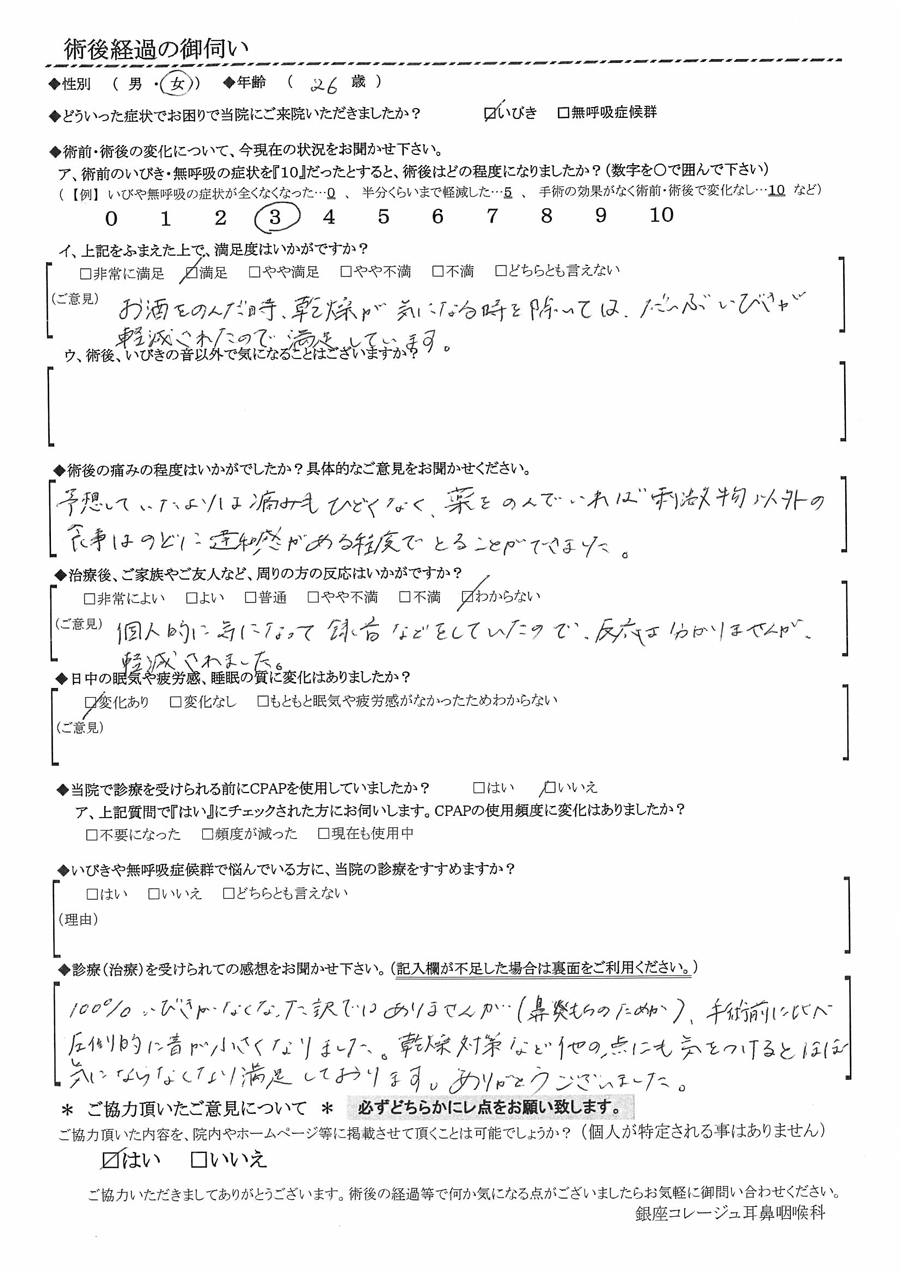 A:100%イビキが無くなった訳ではありませんが(鼻炎持ちのためか)、手術前に比べると圧倒的に音が小さくなりました。乾燥対策などの他の点にも気をつけると、ほぼ気にならなくなり満足しております。