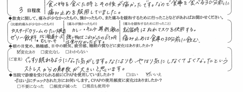 (痛みの程度について) 食べ物を食べた時とその後が痛かったです。