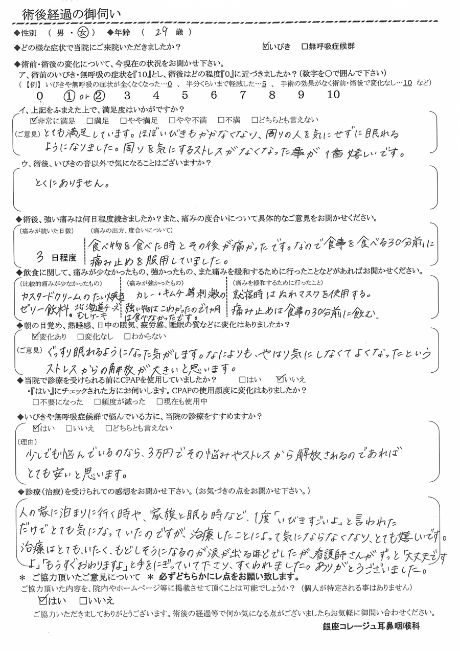 A: 人の家に泊まりに行く時や家族と寝る時に、一度「イビキ凄いよ」と言われただけで、とても気になっていたのですが治療した事によって気にならなくなり、とても嬉しいです。