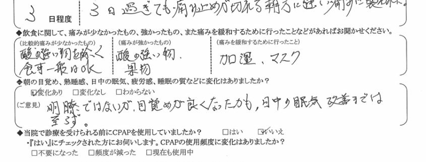 (ご意見) 明瞭ではないが、目覚めが良くなったかも。日中の眠気改善までは至らず。