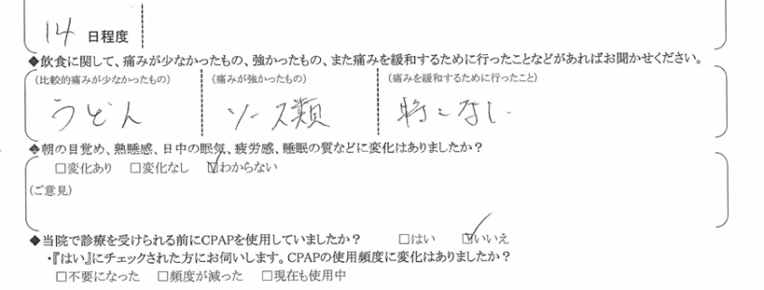 Q.術後、強い痛みは何日程度続きましたか?また、痛みの度合いについて具体的なご意見をお聞かせください。