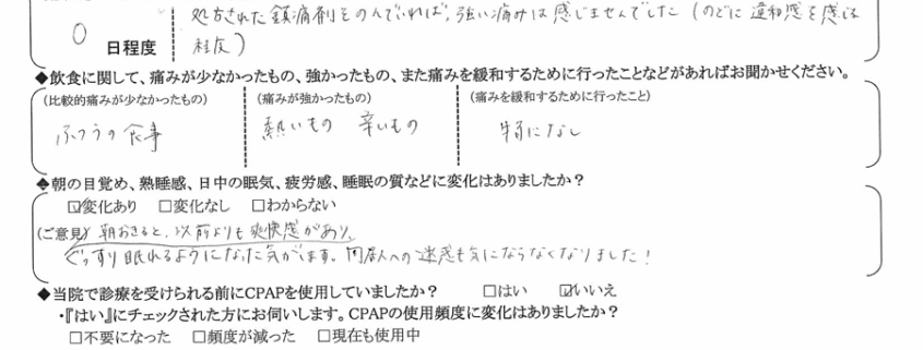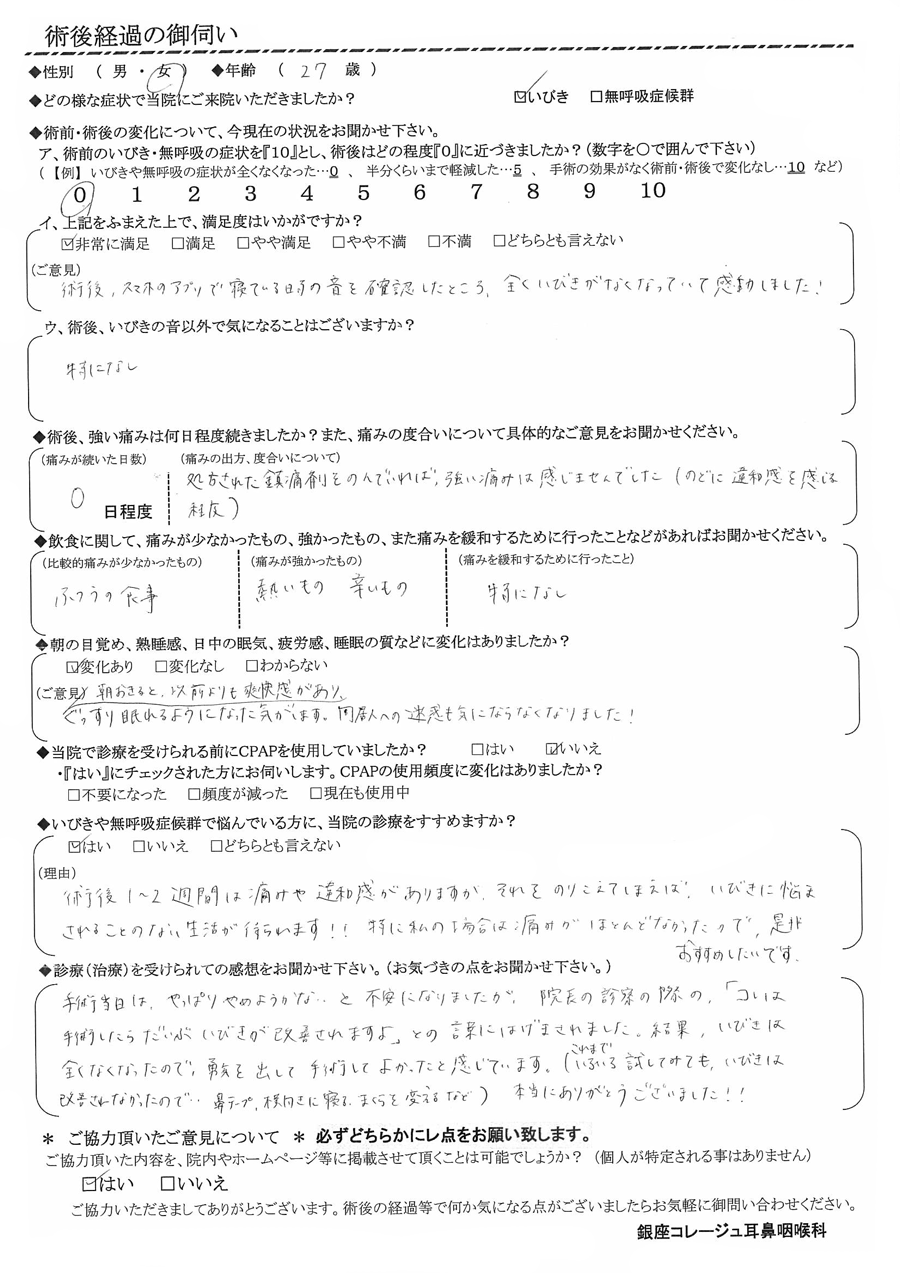 (ご意見) 術後、スマホのアプリで寝ている時の音を確認したところ、全くイビキが無くなっていて感動しました!
