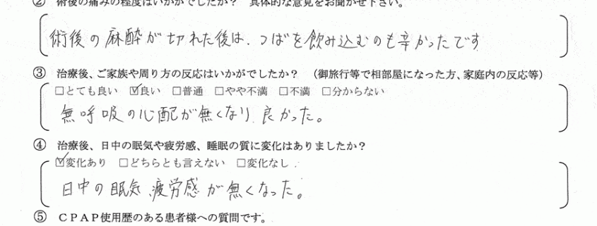 ウ、いびきの音以外で、術後気になる点はございますか?