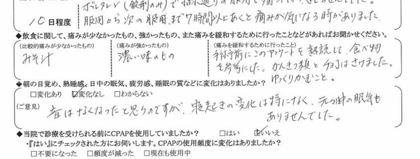 (ご意見) 音は無くなったと思うのですが、寝起きの変化は時になく、元々日中の眠気もありませんでした。